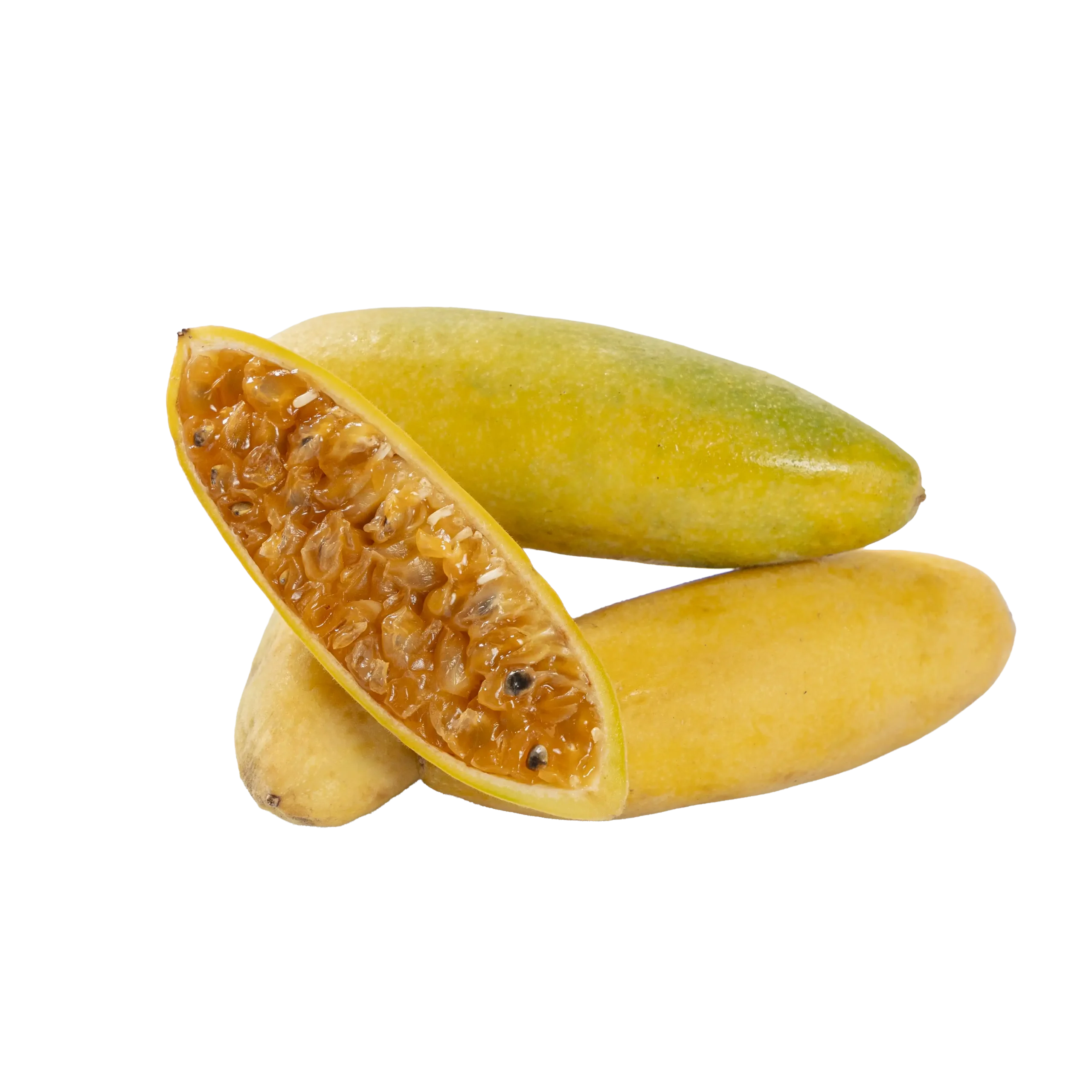 Banana passion fruit, also known as curuba or taxo, is a tropical fruit known for its bright yellow-orange flesh and subtly tangy, aromatic flavor.